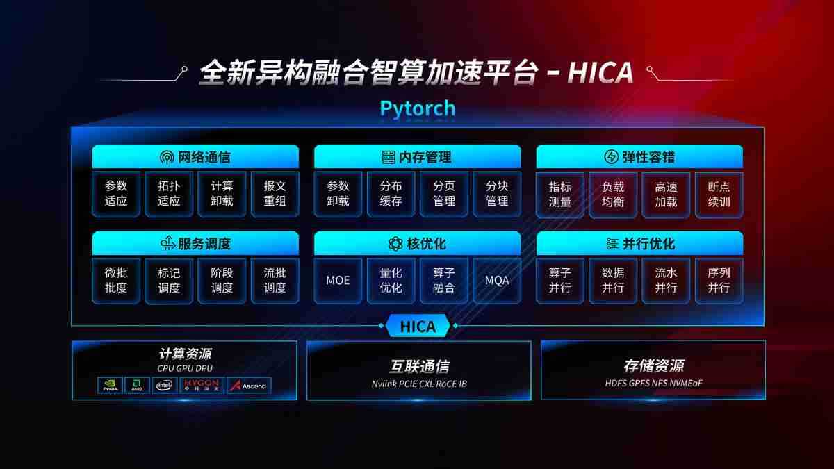 通过自研的服务层、、、中间适配层、、以及调度编排算法,,采用数据并行、、模型并行等多种并行方式,,,,把并行计算任务进行有效的分解,,使其分别由相应的软件栈和算力资源来承接。。当GPU资源变化,,HICA可以实时动态调度计算子任务并调整模型拓扑和架构,,以充分聚合各种算力资源。。。