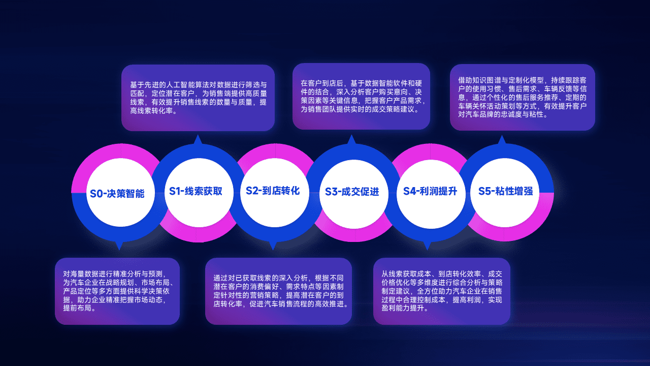 通过拓宽潜在客户来源、、、优化线索分配并提高到店转化率,,,以增强销售效率。。同时,,,利用线索数据不断优化分析模型,,,,有效提升转化率,,,扩大营销影响力。。。